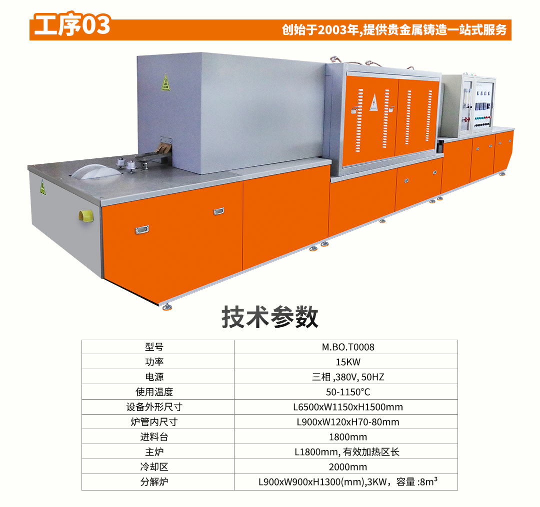 传输机构通过控制装置拖动工件经主炉炉管和冷却水套,在主炉经加热到高温,然后在冷却套部被急剧冷却。整个过程中,炉管与冷却水套内充满氨分解炉分解的气体(氨气通过分解炉时在催化别作用下,温度850°C左右分解成氮气和氨气,其中分解的氨气,保护工件不受氧化,分解的氢气则在进出料口由电子打火装置打火燃烧,阻止空气进入。