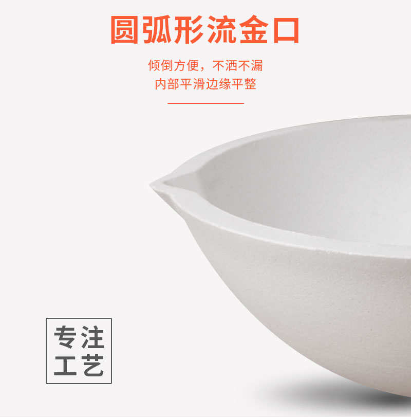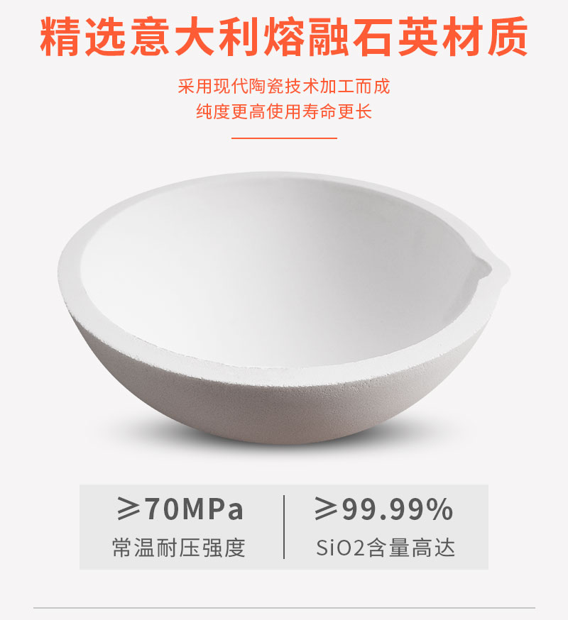 以精选熔融石英为主要原料,用现代陶瓷技术加工制成,主要用于铂金、黄金及其它高温合金的熔化,产品纯度高,耐侵蚀,主成份SiO2含量不小于99.99%,杂质(K2O、Na2O、Fe2O3)含量不大于0.10%,强度高,常温耐压强度≥70MPa,热震性高。