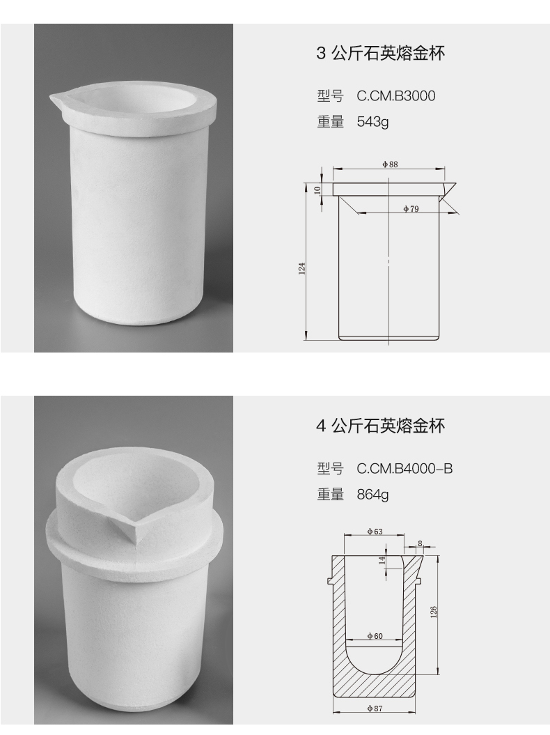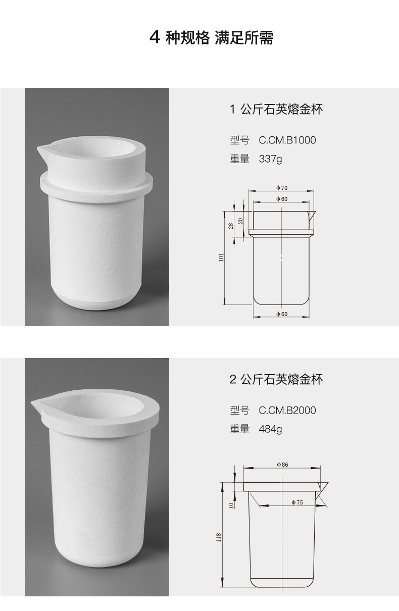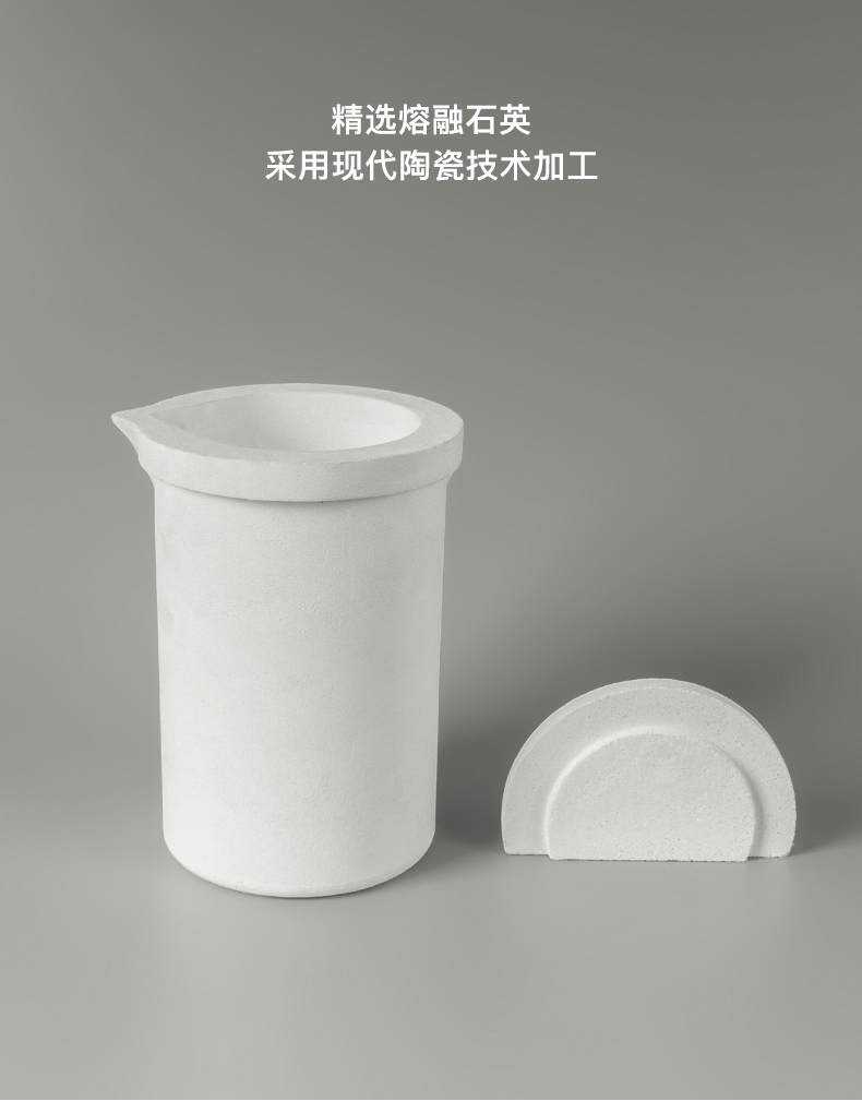 以精选熔融石英为主要原料,用现代陶瓷技术加工制成,主要用于铂金、黄金及其它高温合金的熔化,产品纯度高,耐侵蚀,主成份SiO2含量不小于99.99%,杂质(K2O、Na2O、Fe2O3)含量不大于0.10%,强度高,常温耐压强度≥70MPa,热震性高。