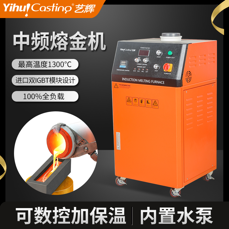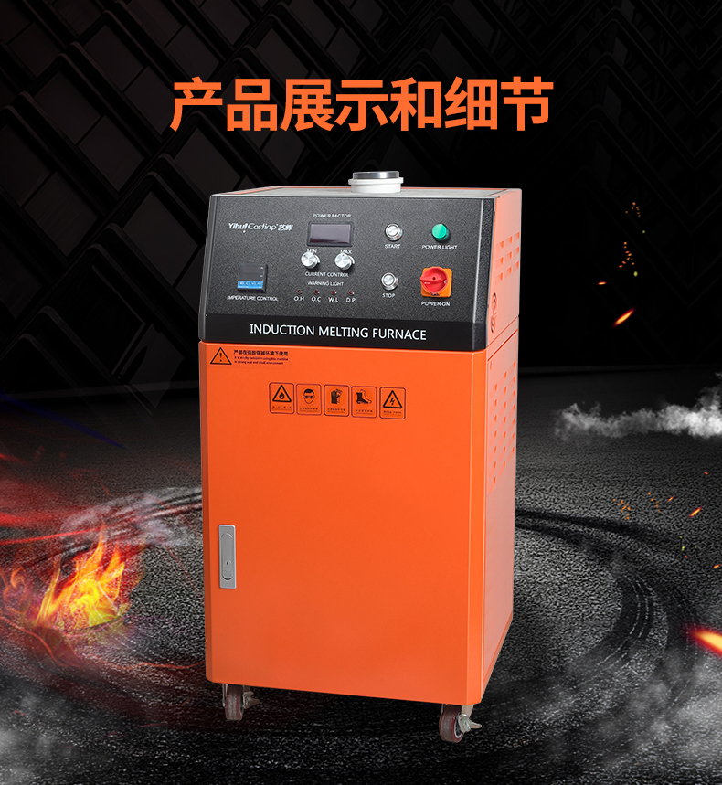 柜式设计、体积小、重量轻,安装操作简单方便,熔化时间约为3-4.5分钟,熔化效率高节电效果好,过载能力强,具有过压、过流、过热、缺水、缺相等多重保护设计,故障自动停机保护。感应线圈不带电安全可靠,进口IGBT模块设计,用料扎实,加热电源稳定耐用,100%全负载,24小时连续工作能力,多重保护设计,故障自动停机保护。