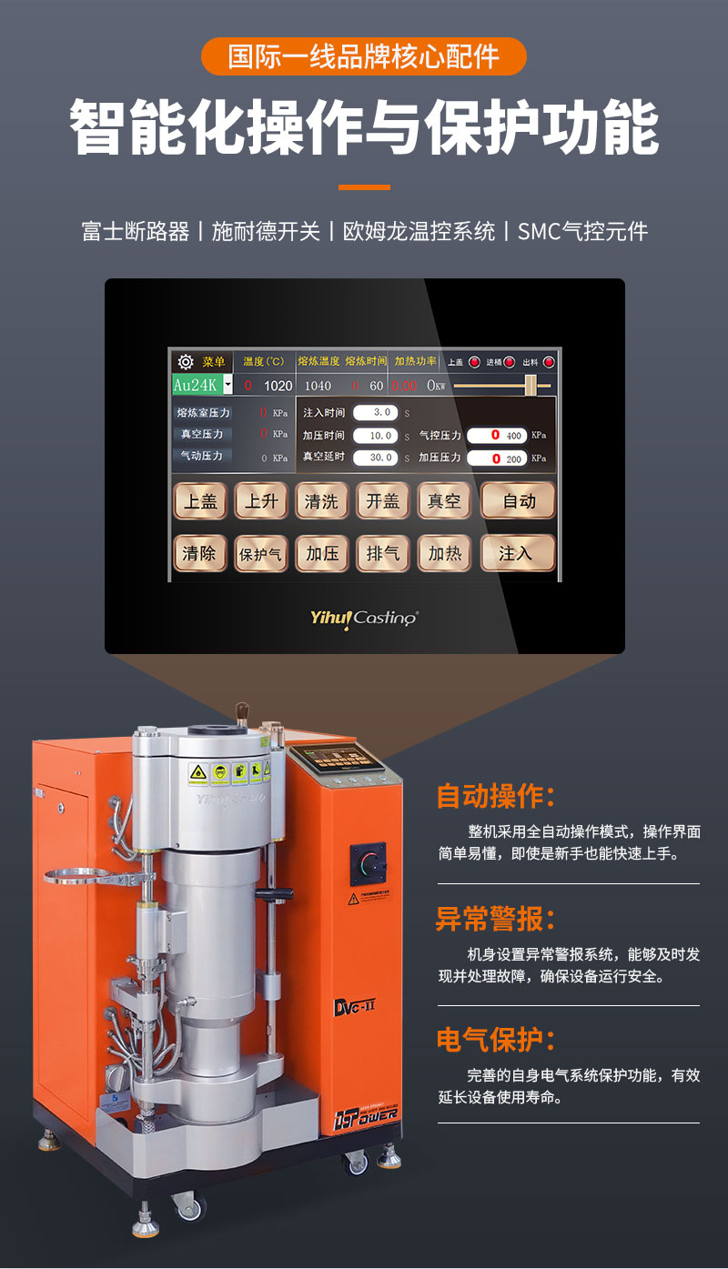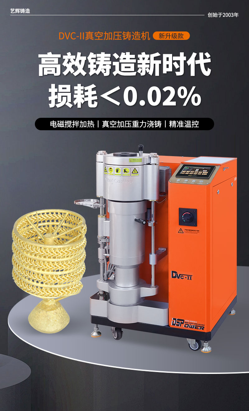 DVC-II自动真空加压铸造机是⼀款程序完全开放式,⽤⼾可⾃由编程满⾜各种⼯艺 、多功能性的真空加压铸造机,加热电源为中频数字处理电源 [注册商标DSPOWER] ,控温精准⼠1%,并带有超强的搅拌能⼒强,⾦属熔炼时处于镜⾯翻滚状态,实测损耗⼩于0.02%,铸造件成⾊⾼。⾃动诊断系统,铸造系统可靠性⾼,如钢盅真空漏⽓不进⾏铸造且⾃动提⽰,等多项保护。