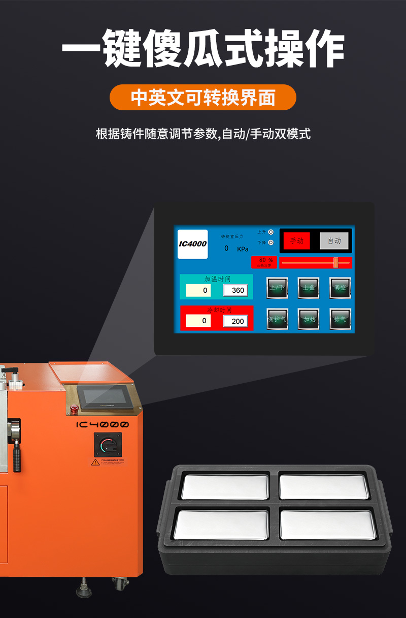 根据需求选择不同规格的石墨油槽,铸锭出不同形状的金属。真空铸锭机铸锭的效果表面光滑,内部无气孔。设备采用触控屏操作,操作流程简单易懂,铸锭过程全自动完成,高效省时。