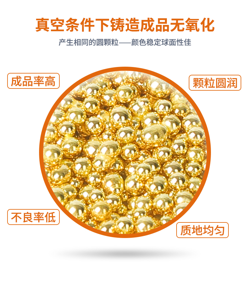 设备造粒颗粒饱满,外表光滑,无氧化。铸造原理:在保护气体下进行加温熔炼,熔炼好后金属液体通过石墨模具孔滴漏到冷却造粒桶形成颗粒状。操作流程简单易懂,整个铸造过程自动完成,一气呵成,高效省时,能让每一个操作员独立完成铸造工作。