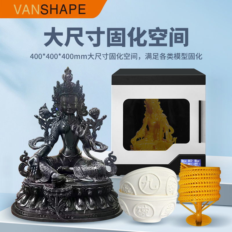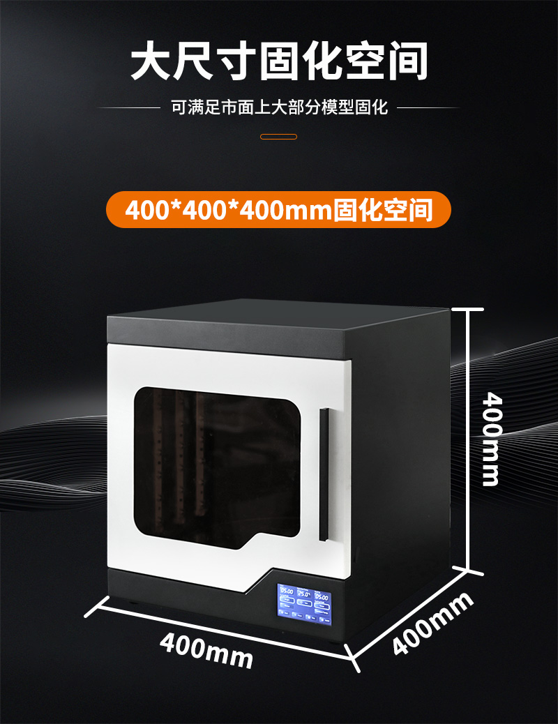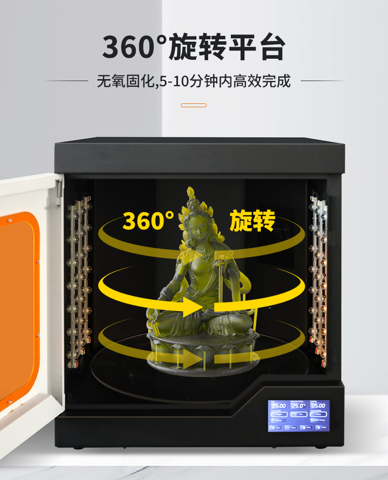 光固化树脂在刚刚打印结束时,表面会有一层未完全固化的软树脂,有一定的残留,通过固化箱二次固化的模型,会比普通模型硬度更高,表面更光滑,打印完后经过固化机几分钟时间就可快速完全固化。