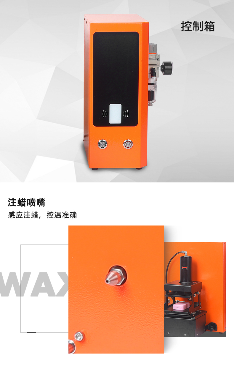 采用一线品牌零部件、高水平工艺制造出的高品质注蜡机。此机配有手动升降夹具,可以让操作员无需使用任何工具,只需用两个手指就可轻松便捷、准确地向上或向下调整胶膜上下位置,使胶膜更容易对准注蜡嘴。