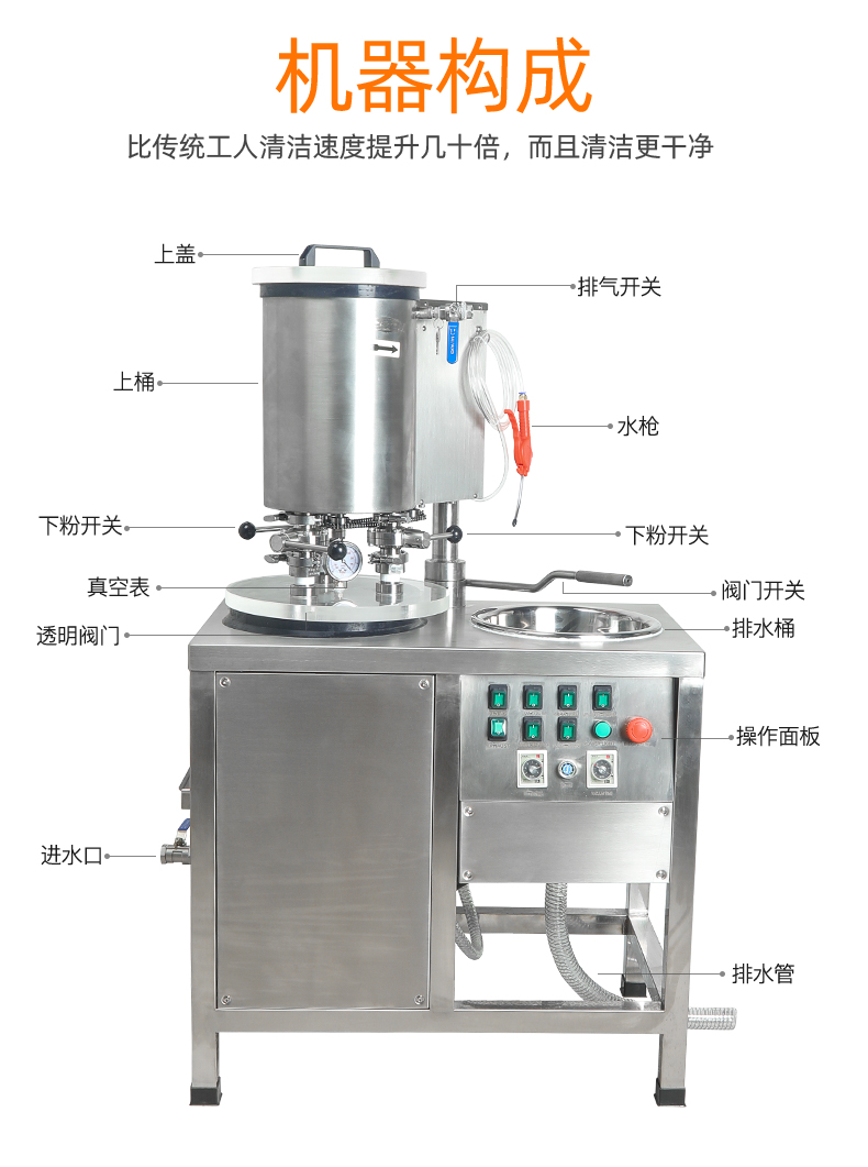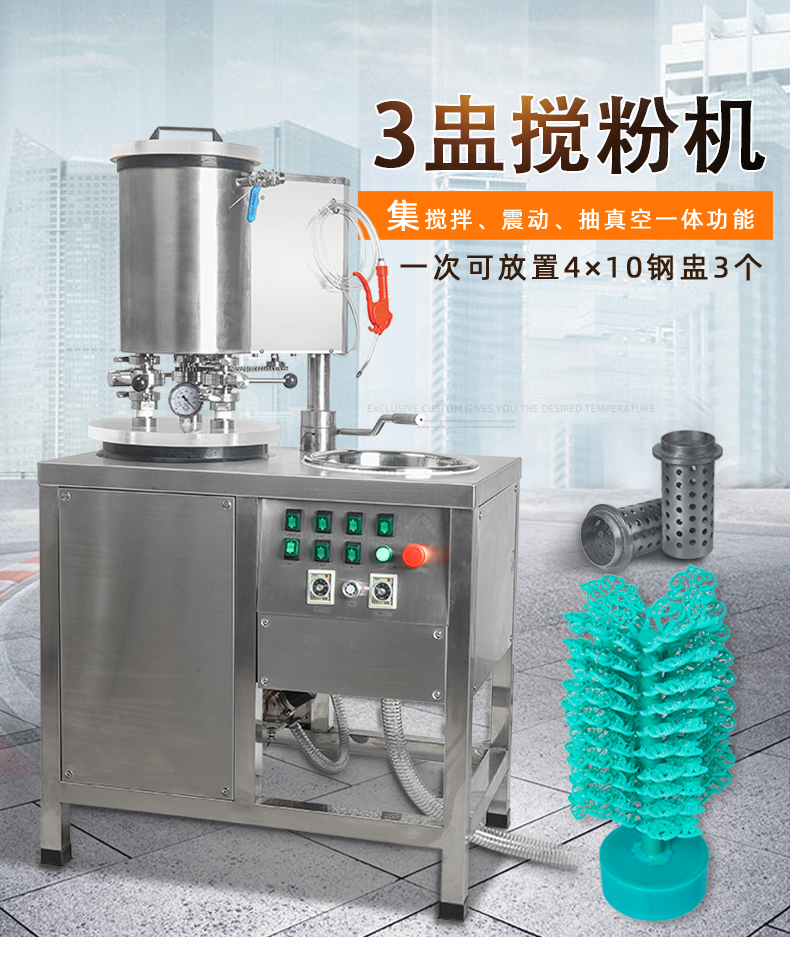 机身采用优质不锈钢材质,下桶最大容量一次可放4"×10"钢盅3个,操作一气呵成,快捷可靠。其性能优越之处在于能够在搅粉时间开始抽真空,使搅拌、注粉、做型整个过程在真空状态一次完成,与一般石膏粉抽真空机比较,省去了搅粉、抽真空、倒粉抽真空等复杂化的操作,还能够减少水珠(金珠、气泡)出现,使产品的光洁度做得更加完美,是高要求精密铸造的必须设备。