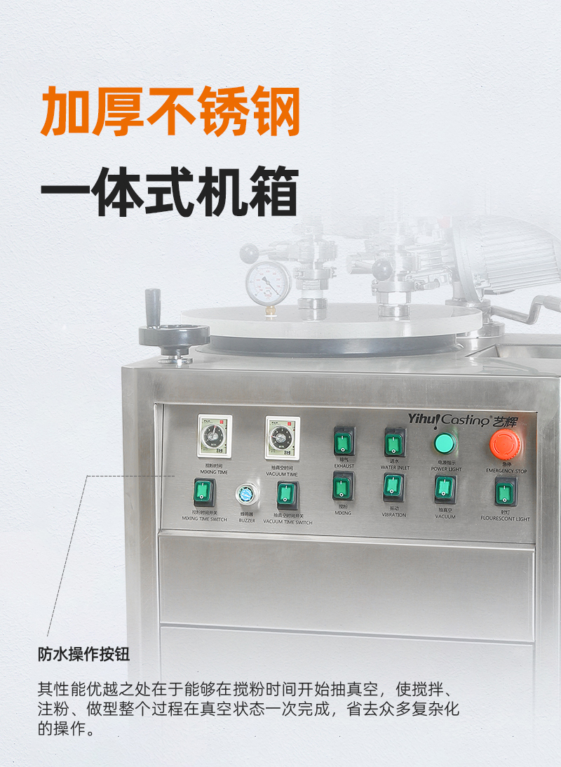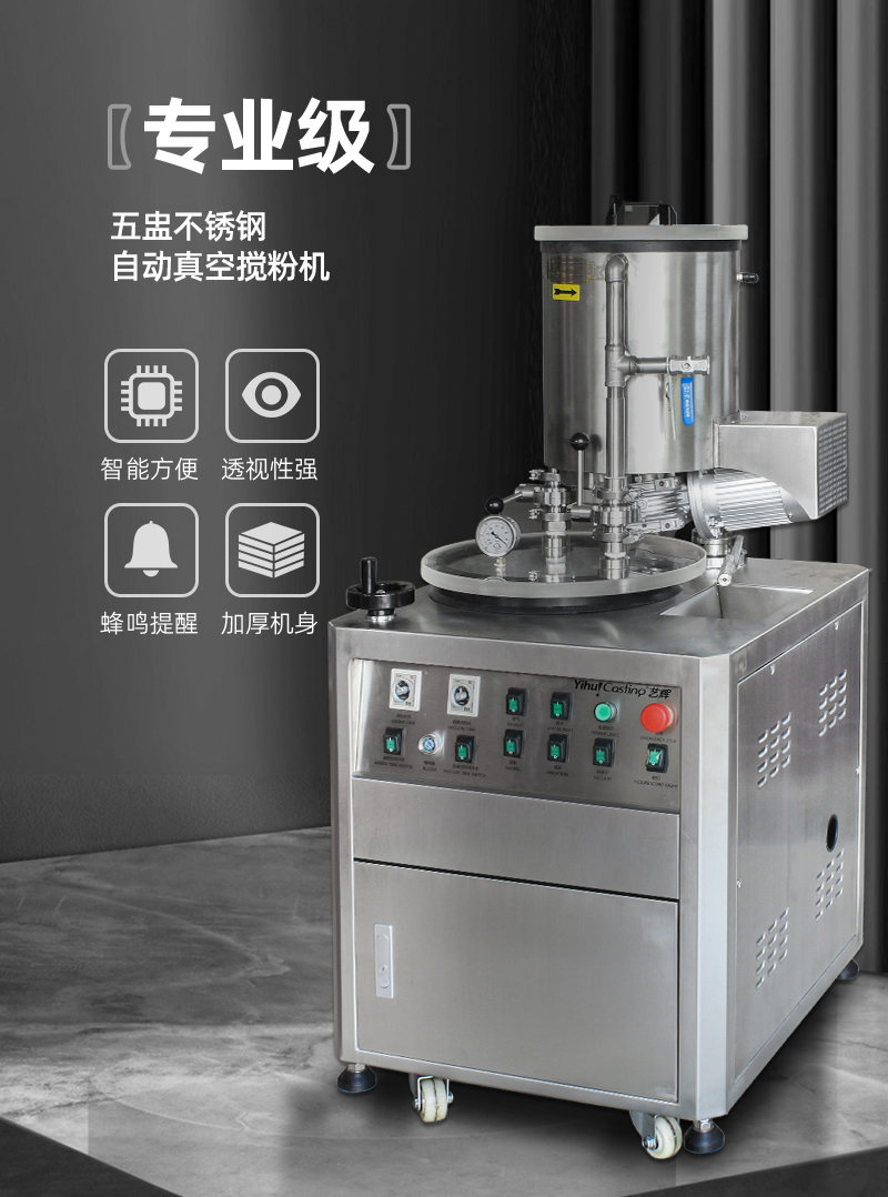 5盅搅粉机最大容量一次可放4"×10"钢盅5个,操作一气呵成,快捷可靠。其性能优越之处在于能够在搅粉时间开始抽真空,使搅拌、注粉、做型整个过程在真空状态一次完成,与一般石膏粉抽真空机比较,省去了搅粉、抽真空、倒粉抽真空等复杂化的操作,还能够减少水珠(金珠、气泡)出现,使产品的光洁度做得更加完美,是高要求精密铸造的必须设备。