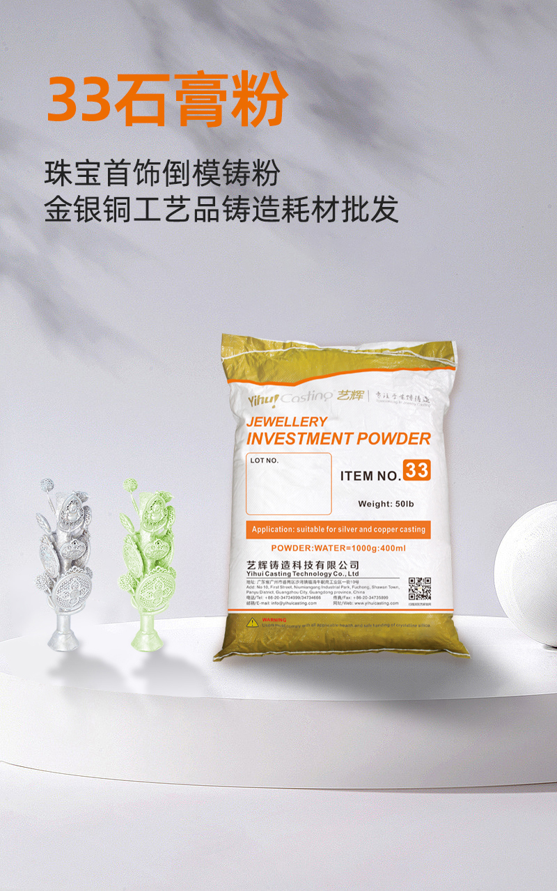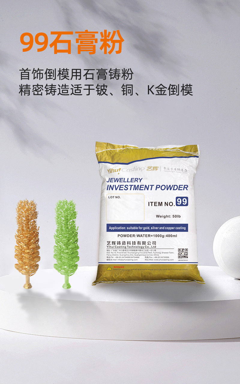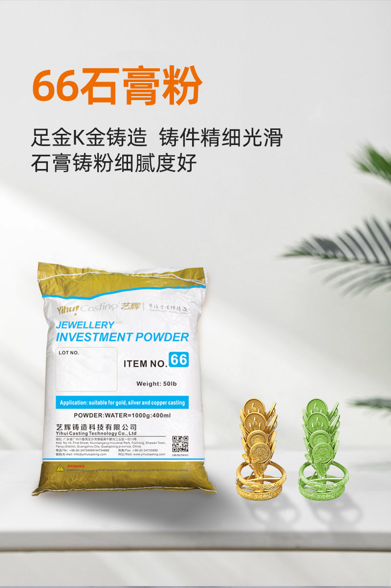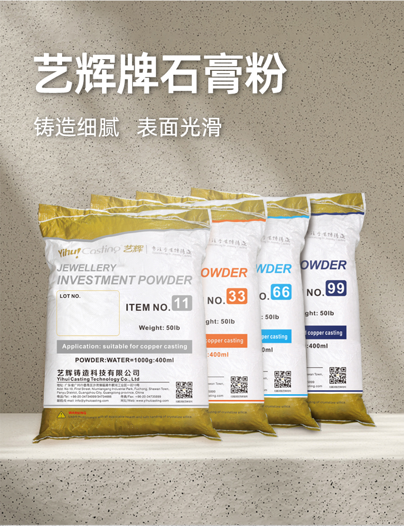 系列产品适合不同产品的不同要求,完全满足对贵金属铸造表面光滑、铸件细腻、无缺陷的要求!同时每个型号我们都有50磅和100磅两种包装!我们也针对铂金和钯金的生产,专门引进了日本的A-1 ( min )石膏粉,同时为了替客户节约生产成本,我们也研发了更加 适合国内客户需求的艺辉牌铂金钯金石膏粉和艺辉牌不锈钢石膏粉。