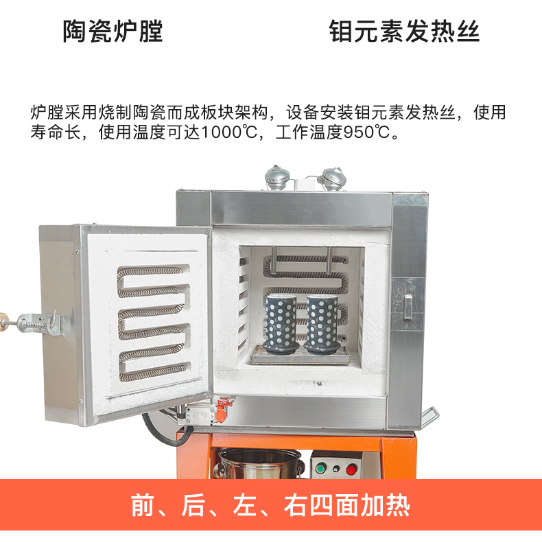 采用进口超高温耐磨保温砖,确保保温性能优,设有断偶保护功能,当热电偶一旦烧坏或失效设备自动关闭,避免电炉失控而引起不必要的损失;分段加热功能,可控制升温速度,以确保产品的烧结质量,能提高优质品率及能够了延长发热丝的寿命,独有的退蜡设计能提高优质品率及能够延长发热元件的使用。